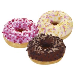 Mini Party Donut - bloem (TARWE, rijst), plantaardige oliën en vetten (palm, koolzaad, kokos, shea), water, suiker, gist, dextrose, zoet weipoeder (MELK), magere MELKpoeder, lactose (MELK), SOJAbloem, zout, TARWEgluten, emulgator (E471, lecithinen, E481), rijsmiddel (E450, E500), natuurlijk aroma, gedesactiveerde gist, glansmiddel (E904, arabische gom), kleurstof (E162, curcumine, paprika-extract). Mini Choco Donut - bloem (TARWE), plantaardige oliën en vetten (palm, koolzaad), water, suiker, cacaomassa, magere MELKpoeder, gist, dextrose, SOJAbloem, magere cacaopoeder (0,7%), zout, TARWEgluten, emulgator (E471, E481, lecithinen), rijsmiddel (E450, E500), zoet weipoeder (MELK), cacaoboter, MELKvet, natuurlijk vanille-aroma, gedesactiveerde gist, natuurlijk aroma. Mini Pinky Donut - bloem (TARWE, rijst), plantaardige oliën en vetten (palm, koolzaad, kokos, zonnebloem), suiker, water, gist, dextrose, zoet weipoeder (MELK), magere MELKpoeder, lactose (MELK), SOJAbloem, zout, TARWEgluten, emulgator (E471, E481, lecithinen), rijsmiddel (E450, E500), cacaoboter, natuurlijk aroma, glucosestroop, geconcentreerd rode bietensap, glansmiddel (E904, E901), gedesactiveerde gist, zuurteregelaar (citroenzuur), geconcentreerd vlierbessensap.