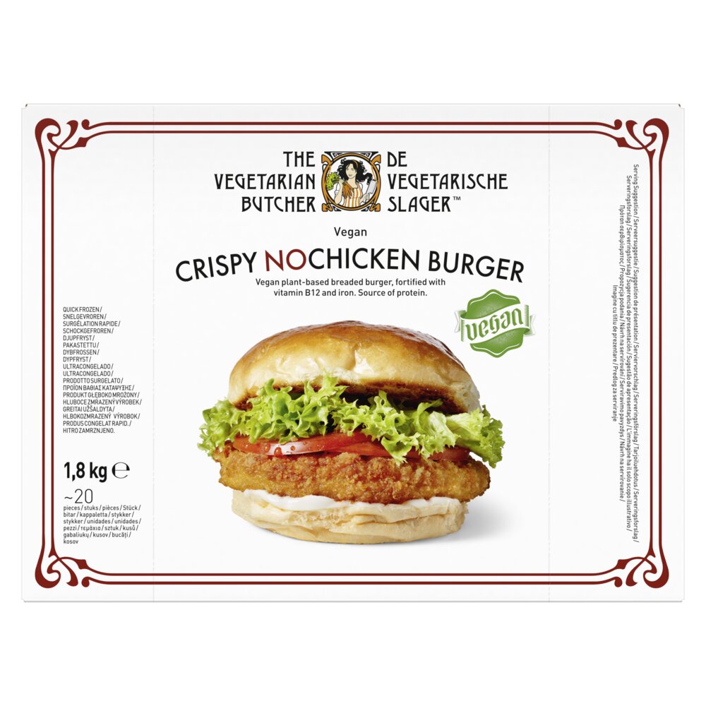 NoChicken Krokante Kipburger is de perfecte vleesvervanger voor de premium gepaneerde kipburger. Gemaakt met de beste ingrediënten, rijk aan vezels en een bron van eiwitten, ijzer en vitamine B12. Geschikt voor een veganistisch dieet. NoChicken Krokante Kipburgers zijn verpakt in een doos van 20 stuks, van 90 gram per stuk. De burgers zijn ook geschikt voor bereiding in de frituur: 2½ minuten (ontdooid) of 3½ minuten (bevroren) op 175°C. Probeer ook eens de andere producten van De Vegetarische Slager.