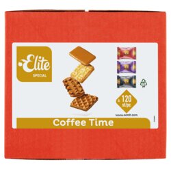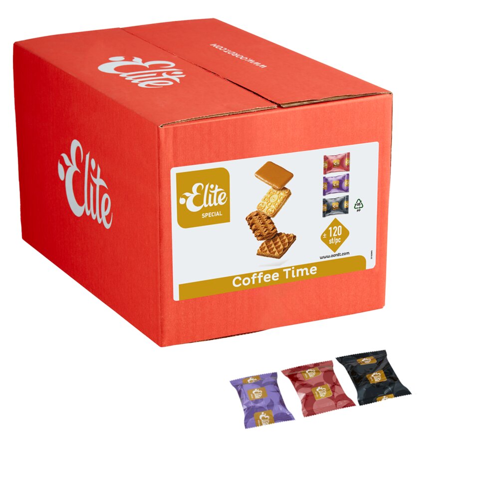De Elite Coffee Time Koekjesmix bevat 4 soorten individueel verpakte koekjes . De mix is onderverdeeld in Bastogne. Café Noir. Koffiewafeltje en Coconut Trio koekjes. Lekker voor bij de koffie of thee. Hygiënisch per stuk verpakt. eenvoudig te serveren. Leverbaar in een omdoos à 120 stuks. Probeer eens ook de andere producten in het assortiment.